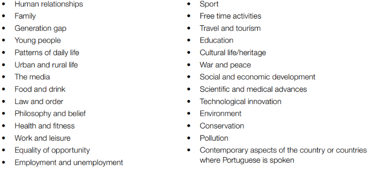 All textual material used in the examinations will be drawn from the topic areas below, with reference to the country or countries where Portuguese is spoken.