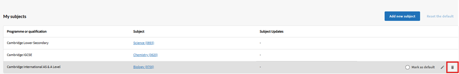 Hover the curser over the syllabus you want to remove from the syllabuses listed in the My Subject section. Click on the bin icon that appears on the right side of the screen.