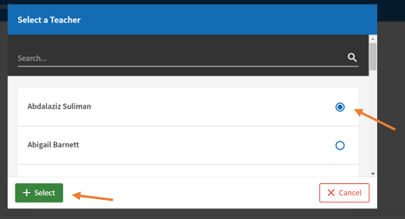 4. Locate and select the teacher you want to transfer the data to and click 'Select'.